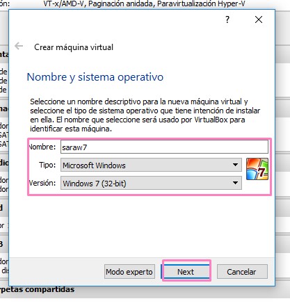 ➜Empezamos poniéndole un nombre a la maquina, después cambiamos la versión a windows7 que es la que queremos utilizar. Y por ultimo a Next.